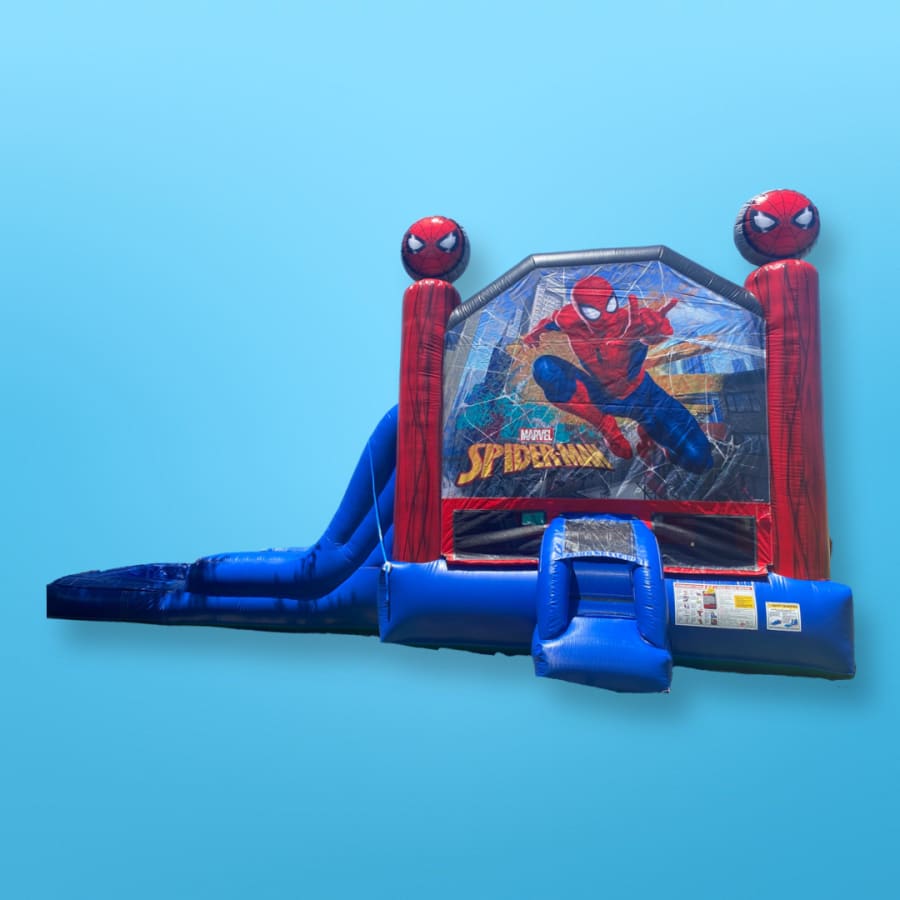 Calling all Spidey fans!!! Our Spider-Man bounce house is ready to swing into your next event. This features a 15x15 jump area, slide with pool landing and basketball hoop. It can be used with or without water.